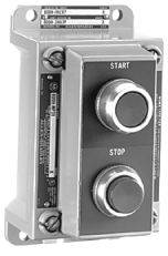 Estación de pulsadores para áreas peligrosas ensamblada 800H, tipo 7 y 9. Con dos pulsadores: verde de arranque al ras y rojo de parada extendida. Componentes: botones tipo
